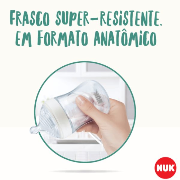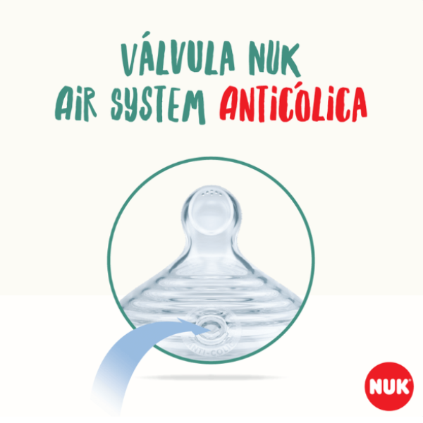 para o correto posicionamento da língua durante a sucção. Sua válvula NUK Air System Anticólica reduz a formação e ingestão de bolhas de ar durante a alimentação, proporcionando