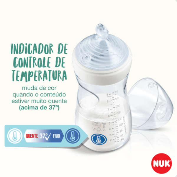 durante a alimentação. O novo indicador de controle de temperatura possui a sinalização do termômetro, localizada próximo à escala de graduação do frasco, que ajuda os pais na